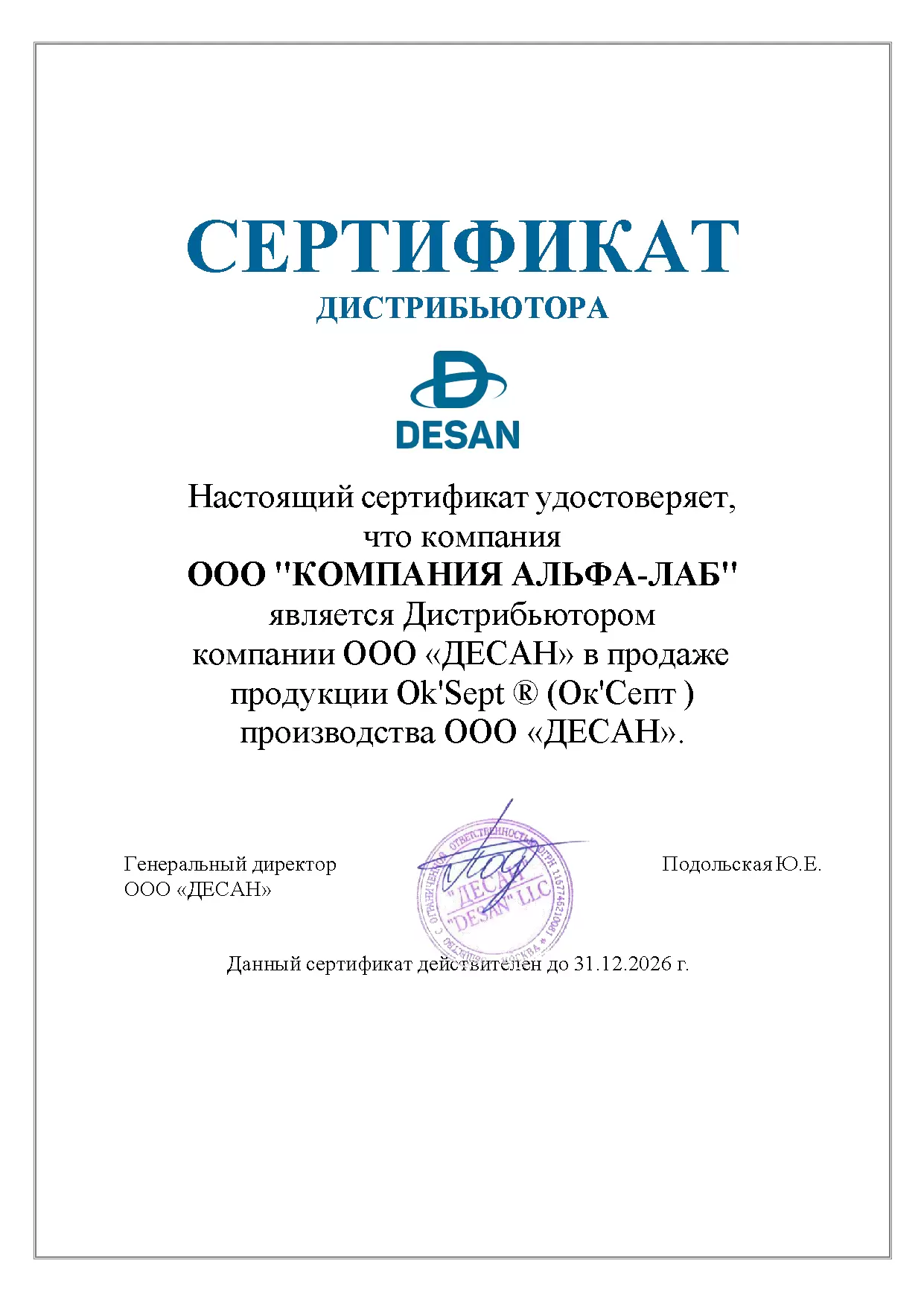 Данный сертификат подтверждает, что компания Альфа-Лаб является официальным дистрибьютором продукции Ok'Sept ® на территории Российской Федерации.
