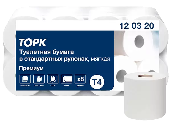 Двухслойная туалетная бумага в рулонах Торк T4 Премиум (120320) обеспечит вашим гостям домашний комфорт вдали от дома. Эта мягкая туалетная бумага превосходна на вид и на ощупь и обладает характеристиками, которые необходимы в туалетных комнатах с низкой проходимостью.