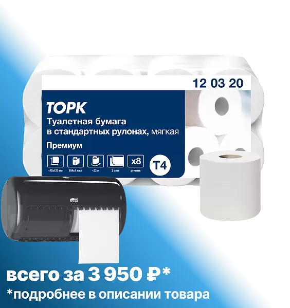 При покупке большой упаковки туалетной бумаги Торк T4 Премиум вы получите диспенсер Торк T4 Элевейшн всего за 3950!