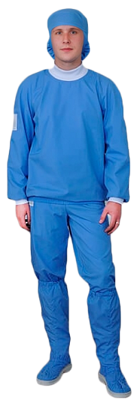 Костюм мужской Б-409 предназначен для персонала неклассифицируемых помещений. Костюм Б-409 состоит из куртки со стойким воротником и брюк. Куртка прямого силуэта с длинным полуреганом. Брюки — прямые, свободные формы. Вентиляционные элементы расположены в пройме рукавов и средней ширины брюк. Изделие можно автоклавировать в стандартных режимах (120-132°С, 20-45 минут) и выдерживает не менее 75 циклов «стирка — стерилизация».