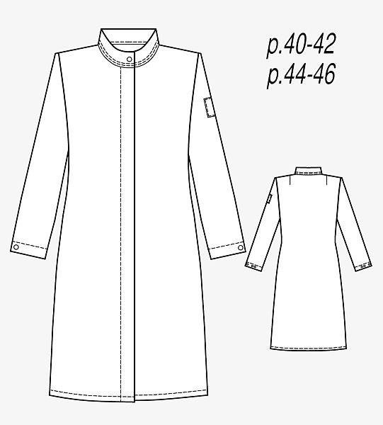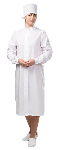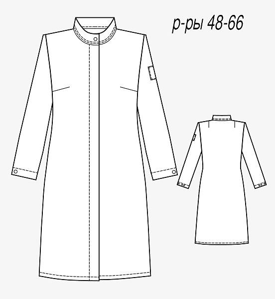 Многоразовый халат Б-121 - халат прямого силуэта для работы в чистых помещениях класса ISO 3 и выше. Модель женского халата прямого силуэта, с длинными рукавами, втачными, одношовными, с цельнокроеными манжетами, застегивающимися на кнопки. Закрытый воротник-стойка. На полочке по линии груди с 48 по 66 размер расположены вытачки, с 40 по 46 размер вытачек по груди нет. Спинка цельнокроеная, по спинке от плечевого шва вниз расположены вытачки. Все соединительные швы окантованы. Вентиляционные элементы расположены в пройме рукавов, если изделие изготовлено из ткани «Поликарбон». Если изделие изготовлено из ткани «Арт. 16405», вентиляционные элементы отсутствуют.