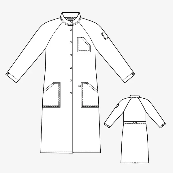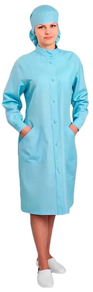 Многоразовый халат Б-250 - женский халат прямого силуэта для работы в чистых помещениях класса ISO 3-8. Халат полуприлегающего силуэта с центральной бортовой застежкой на кнопки и воротником — стойкой с застёжкой на кнопку. Спереди находятся два нижних накладных кармана и один нагрудный накладной карман. Входы в карманы скошены. В левый нижний карман вшит знак EPA. Рукава покроя «полуреглан», длинные, прямые, с цельнокроёными манжетами, застёгивающимися на кнопки (2 положения фиксации). На внешней стороне левого рукава настрочена нашивка с надписью «Одежда технологическая для персонала чистых помещений», с таблицей циклов обработки и датой выпуска изделия. НС изнаночной стороны под воротником вшита вешалка. Сзади на линии талии — хлястик с застежкой на кнопки.