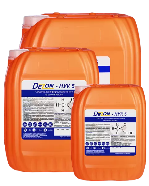 Дезон НУК-5 обладает антимикробной активностью в отношении бактерий, дрожжеподобных грибов и дрожжей, плесневых грибов, спор бацилл- специфической микрофлоры предприятий пищевой и перерабатывающей промышленности. Эффективно удаляет минеральные отложения, денатурированный белок, фосфатные отложения.
