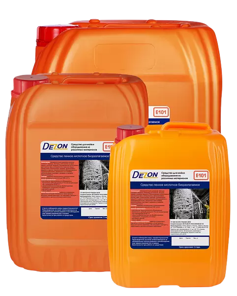 Дезон E101 - для пенной обработки оборудования и поверхностей в любых отраслях пищевой и перерабатывающей промышленности. Эффективно удаляет сложные минеральные и органические отложения, в т.ч. водный, мясной и молочный камень, ржавчину, накипь, известь, масляные, белковые и атмосферные загрязнения. Применяется только для кислотостойких поверхностей, а также для мойки оборудования из цветных металлов.