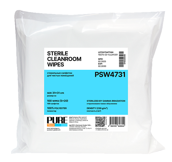Стерильные салфетки Puretech® PSW4731 - двухслойные салфетки из 100% полиэстера. Обеспечивают высокую сорбционную ёмкость при низком уровне загрязнения и отделения частиц.