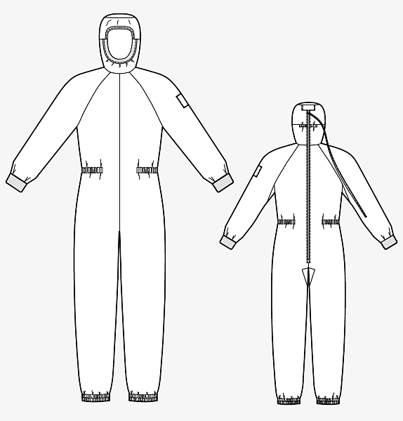 - Застежка-молния на спинке (для удобства застегивания молнии предусмотрен шнур из основной ткани комбинезона, который убирается под клапан, расположенный на затылочной части капюшона).